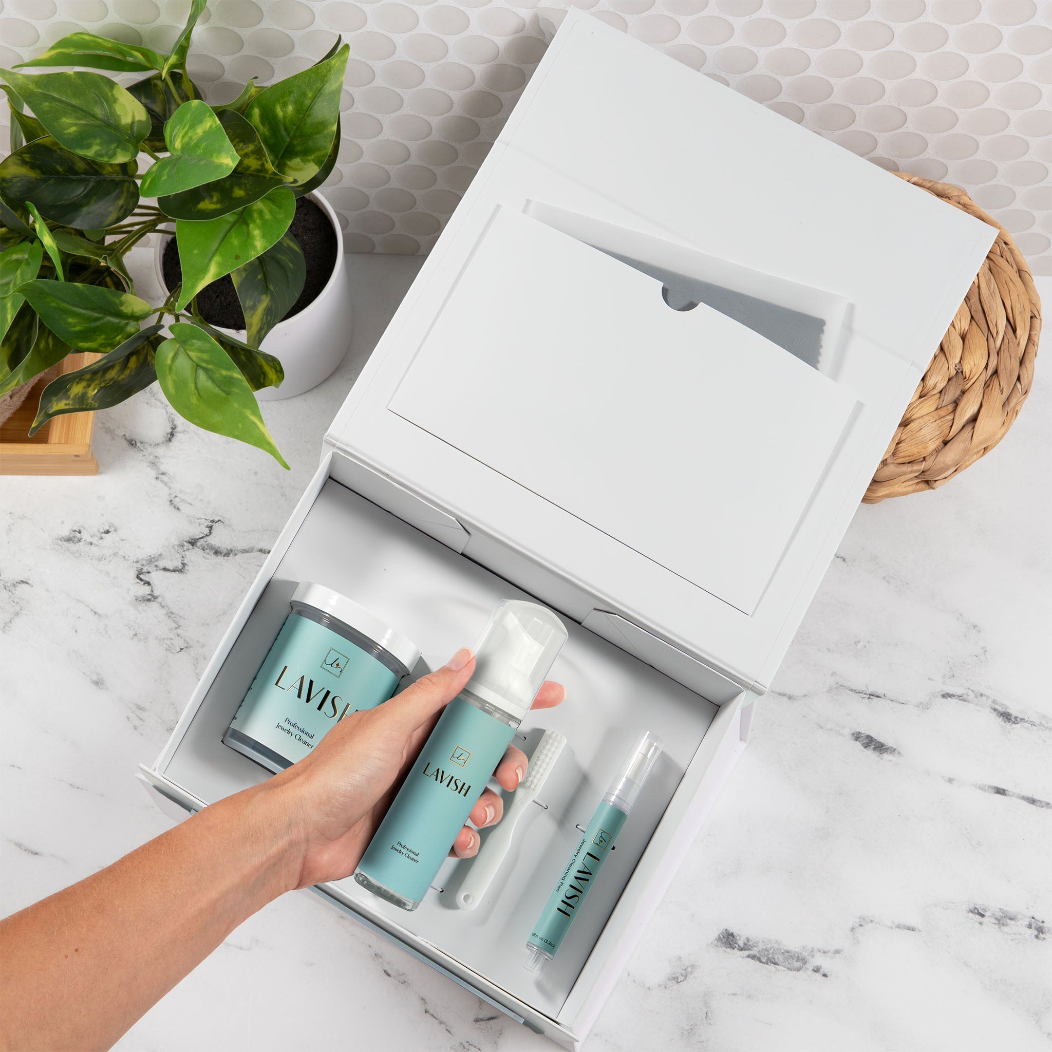 Elevate your jewelry care routine with the Lavish Spa Box. This all-in-one kit provides everything you need to keep your precious pieces sparkling and well-maintained.